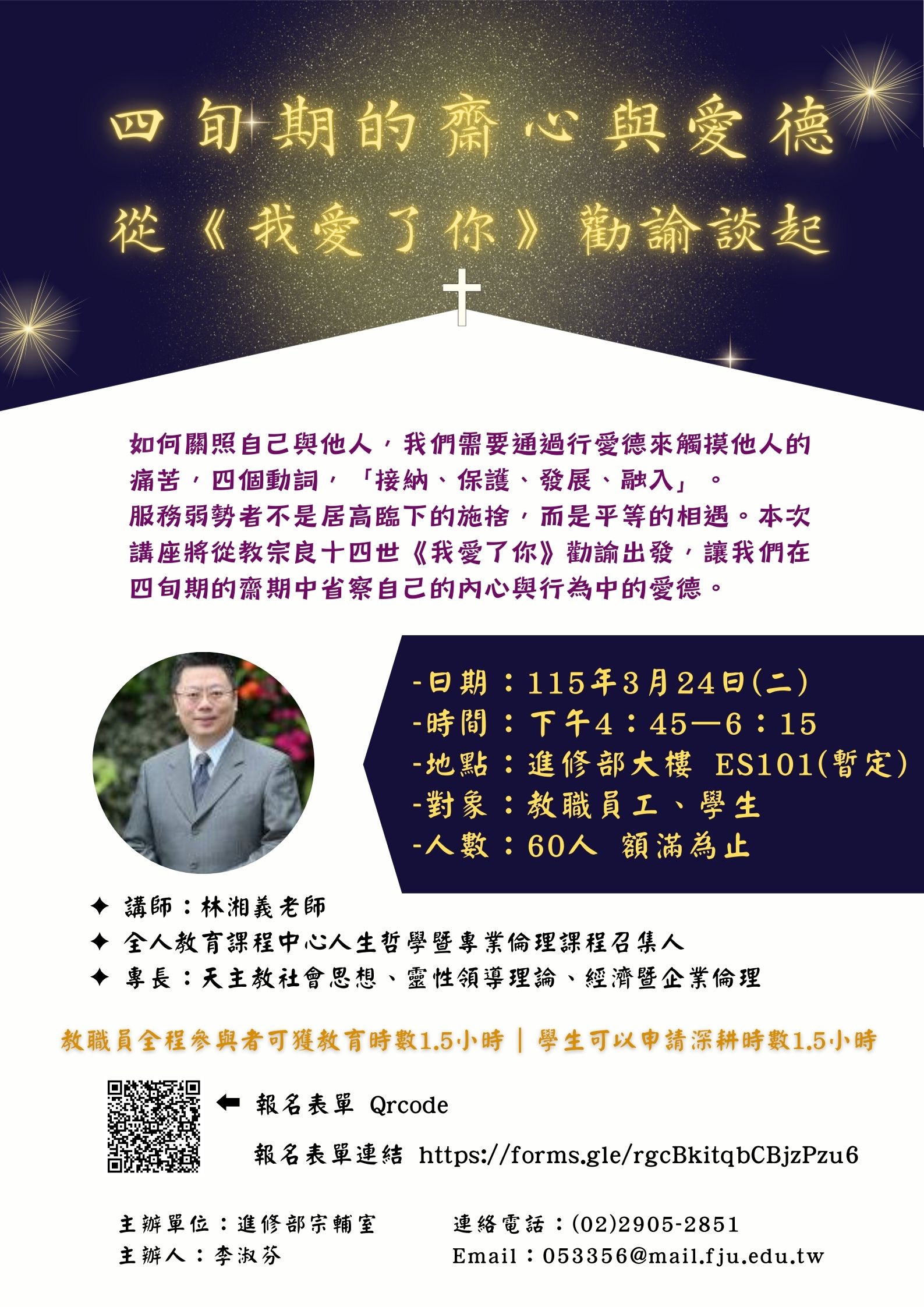 如何關照自己與他人,我們需要通過行愛德來觸摸他人的痛苦,四個動詞,「接納、保護、發展、融入」。 服務弱勢者不是居高臨下的施捨,而是平等的相遇。本次講座將從教宗良十四世《我愛了你》勸諭出發,讓我們在四旬期的齋期中省察自己的內心與行為中的愛德。
